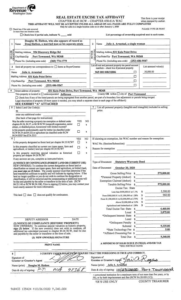 | 2 | 10/20/2020 | SWD | Statutory Warranty Deed | DOUGLAS M HATHON | JULIE A ARNESTAD | | | $575,000.00 | 135424 | |