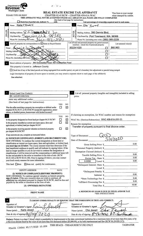 | 1 | 07/29/2020 | SWD | Statutory Warranty Deed | DOUGLAS D LEE | MARK ELLIOTT & JENNIFER MASON | | | $450,000.00 | 134807 | |