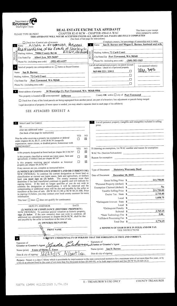 | 3 | 12/18/2015 | SWD | Statutory Warranty Deed | SHIRLEY L ENSOR | IAN D & MEGAN E BARNES | | | $211,750.00 | 124590 | |