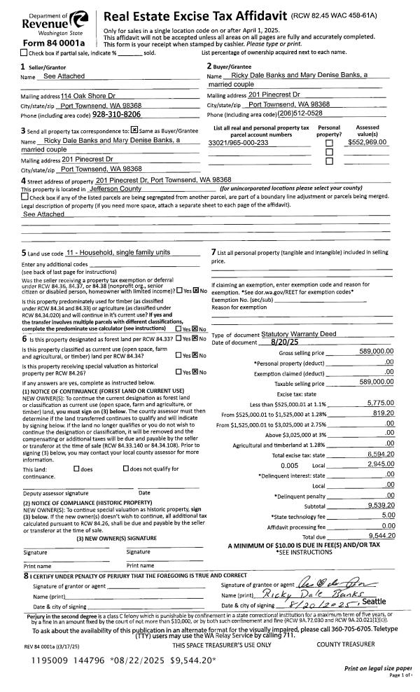 | 1 | 08/20/2025 | SWD | Statutory Warranty Deed | JEAN E WILCOX | RICKY D & MARY D BANKS | | | $589,000.00 | 144796 | |