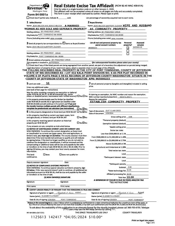 | 2 | 03/29/2024 | QCD | Quit Claim Deed | JEAN E WILCOX | JEAN E WILCOX | | | | 142417 | |