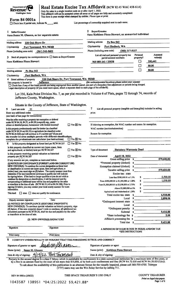 | 1 | 04/18/2022 | SWD | Statutory Warranty Deed | SUSAN M GLEASON | KATHLEEN F STEWART | | | $579,600.00 | 138951 | |