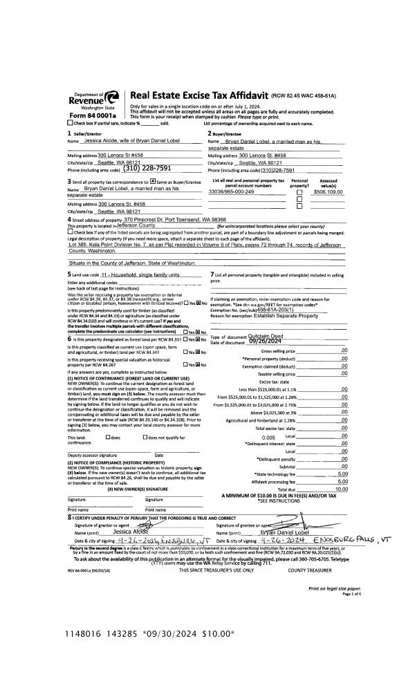 | 1 | 09/26/2024 | QCD | Quit Claim Deed | JESSICA ALCIDE | BRYAN D LOBEL | | | | 143285 | |