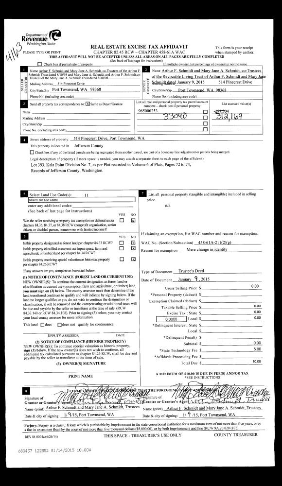 | 3 | 12/20/2012 | QCD | Quit Claim Deed | ARTHUR & MARY JANE | ARTHUR & MARY JANE SCHMIDT REV LIVING TRUST | | | | 118558 | |