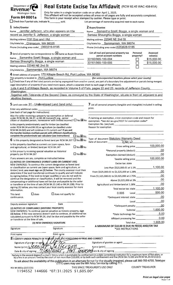 | 1 | 07/30/2025 | SWD | Statutory Warranty Deed | JENNIFER JEFFERSON | SAMANTHA S BOGGS | | | $100,000.00 | 144666 | |