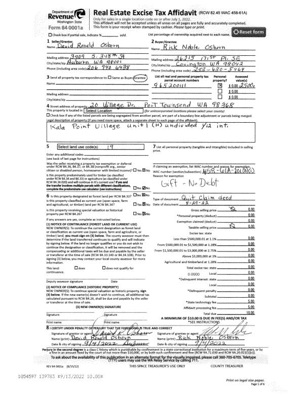 | 1 | 08/29/2022 | QCD | Quit Claim Deed | DAVID R OSBORN | RICK NOBLE OSBORN | | | | 139783 | |