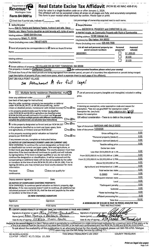 | 1 | 01/23/2026 | BSD | Bargain and Sale Deed | ALAN S PAREIRA | ANDREW M PEABODY & | | | | 145603 | |