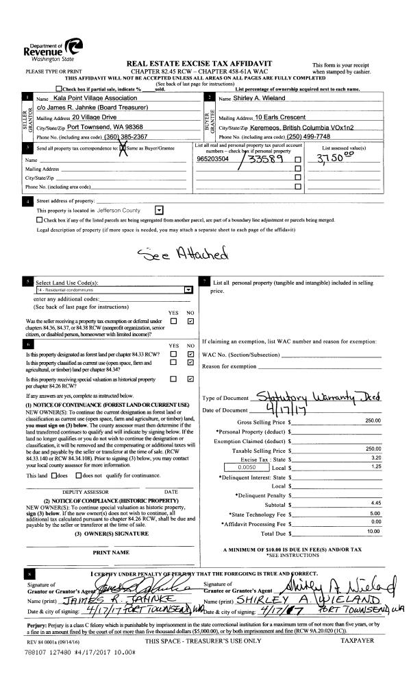 | 2 | 04/17/2017 | SWD | Statutory Warranty Deed | KALA POINT VILLAGE ASSOCIATION | SHIRLEY A WIELAND | | | $250.00 | 127480 | |
