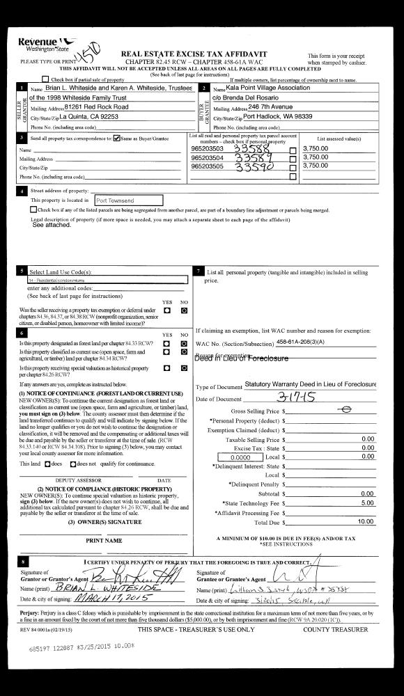 | 3 | 03/17/2015 | DILF | Deed in Lieu of Foreclosure | BRIAN L WHITESIDE TRTE | KALA POINT VILLAGE ASSOCIATION | | | | 122887 | |