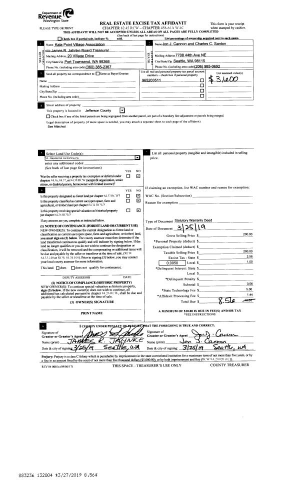 | 1 | 03/27/2019 | SWD | Statutory Warranty Deed | KALA POINT VILLAGE ASSOCIATION | JON J CANNON | | | $200.00 | 132004 | |