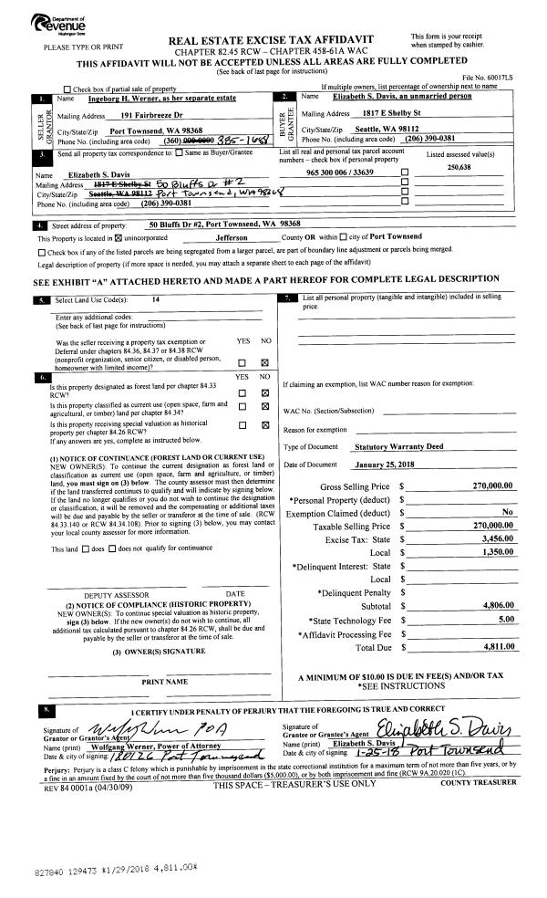 | 4 | 01/25/2018 | SWD | Statutory Warranty Deed | INGEBORG H WERNER | ELIZABETH S DAVIS | | | $270,000.00 | 129473 | |