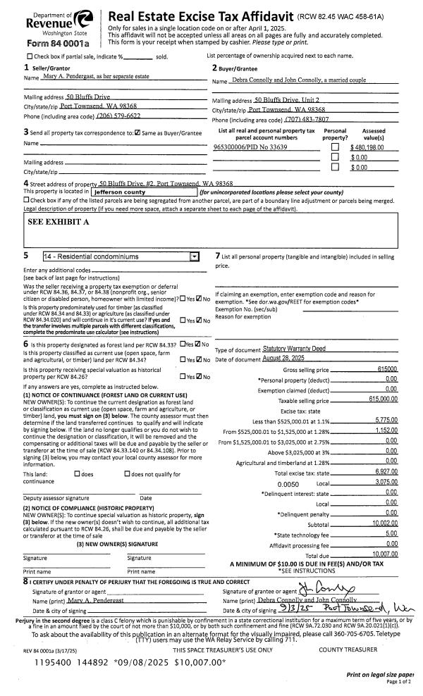 | 1 | 08/28/2025 | SWD | Statutory Warranty Deed | MARY A PENDERGAST | JOHN & DEBRA CONNOLLY | | | $615,000.00 | 144892 | |