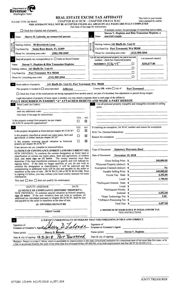 | 1 | 11/15/2018 | SWD | Statutory Warranty Deed | SHERRY D LALONDE | STEVEN & RITA HOPKINS | | | $340,000.00 | 131494 | |