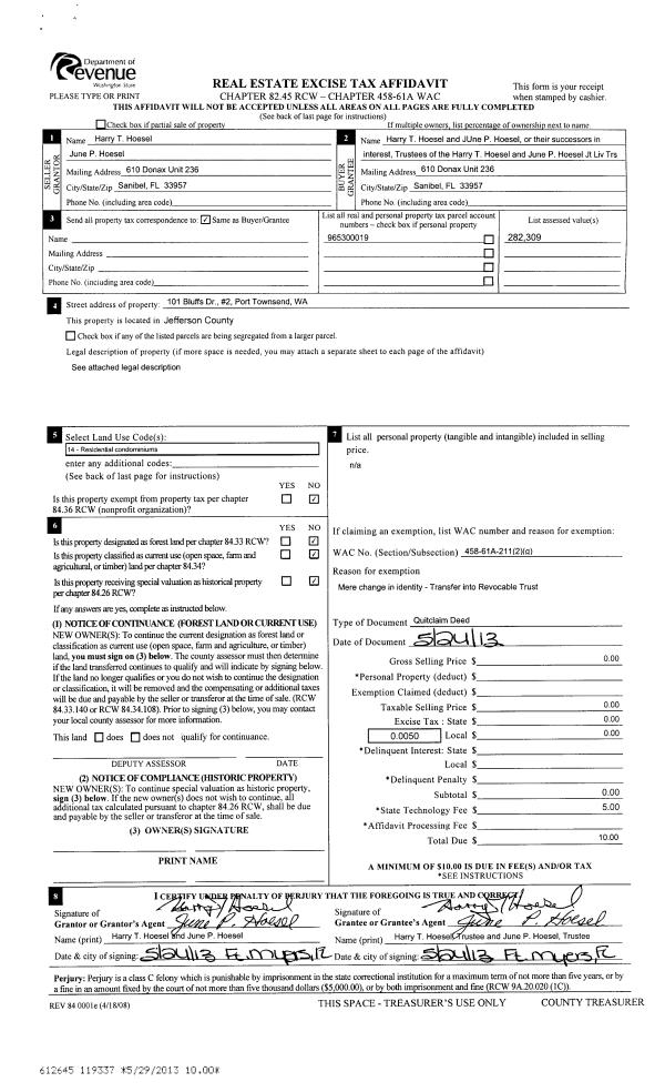 | 1 | 05/24/2013 | QCD | Quit Claim Deed | HARRY T & JUNE P HOESEL | HARRY T & JUNE P HOESEL JT LIV TRUST | | | | 119337 | |
