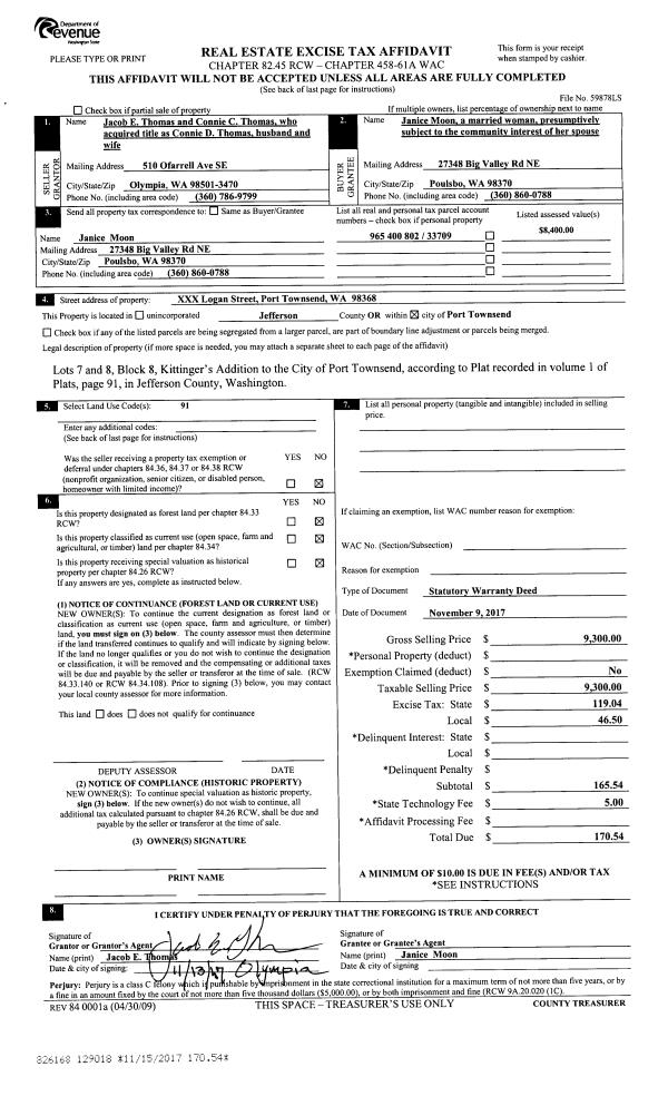 | 1 | 11/09/2017 | SWD | Statutory Warranty Deed | JACOB E THOMAS | JANICE M MOON | | | $9,300.00 | 129018 | |