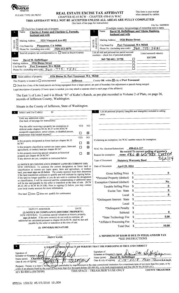 | 4 | 04/29/2014 | SWD | Statutory Warranty Deed | CHARLES J FOSTER | DAVID HEFFELFINGER & VIBEKE DANBORG | | | $289,000.00 | 121110 | |
