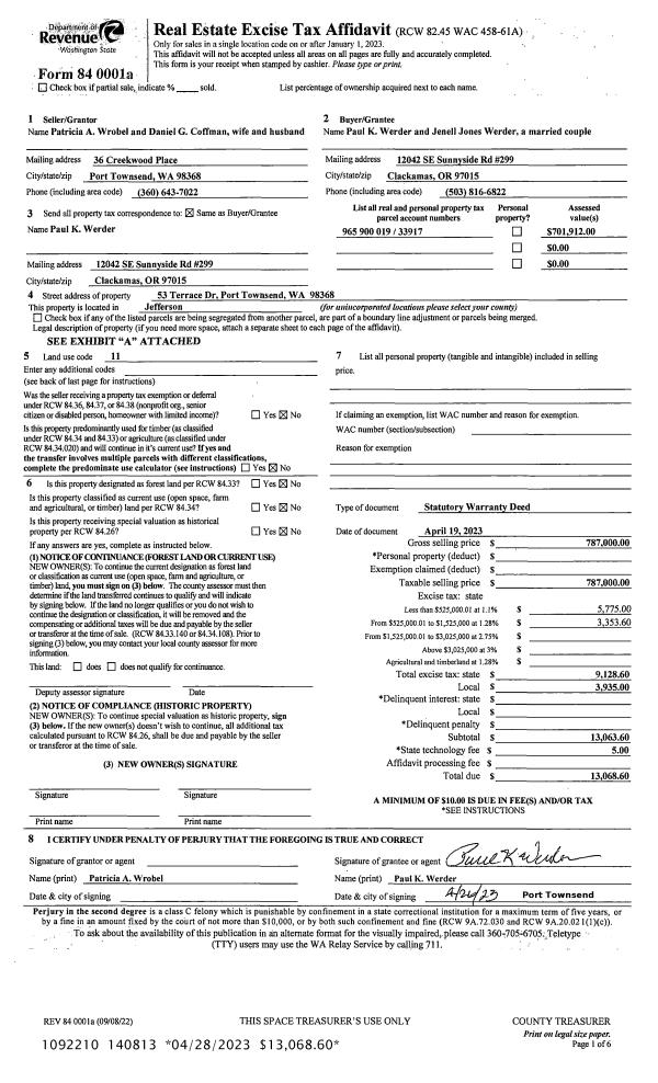 | 1 | 04/19/2023 | SWD | Statutory Warranty Deed | PATRICIA A WROBEL & DANIEL G COFFMAN | PAUL K & JENELL J WERDER | | | $787,000.00 | 140813 | |