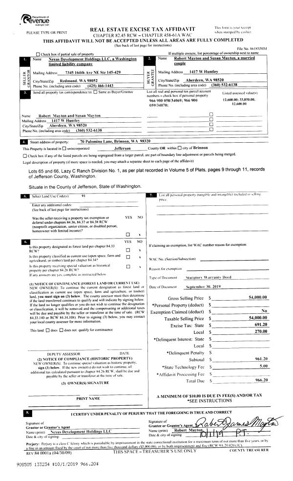 | 1 | 09/30/2019 | SWD | Statutory Warranty Deed | NEXUS DEVELOPMENT HOLDINGS LLC | ROBERT & SUSAN MAYTON | | | $54,000.00 | 133234 | |