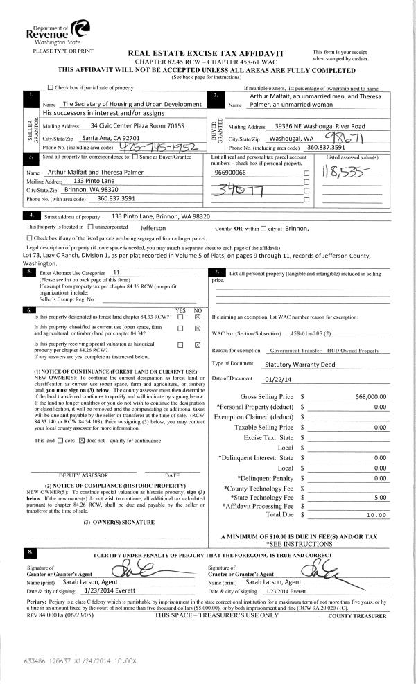 | 3 | 01/22/2014 | SWD | Statutory Warranty Deed | SECRETARY OF HOUSING & | ARTHUR R MALFAIT | | | $68,000.00 | 120637 | |