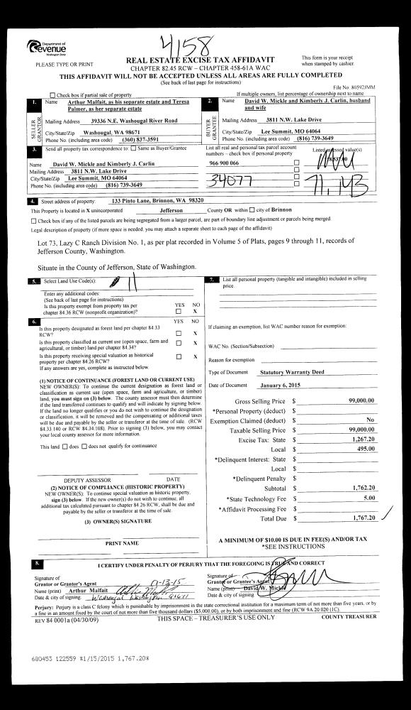 | 2 | 01/06/2015 | SWD | Statutory Warranty Deed | ARTHUR R MALFAIT | DAVID MICKLE & KIMBERLY CARLIN | | | $99,000.00 | 122559 | |