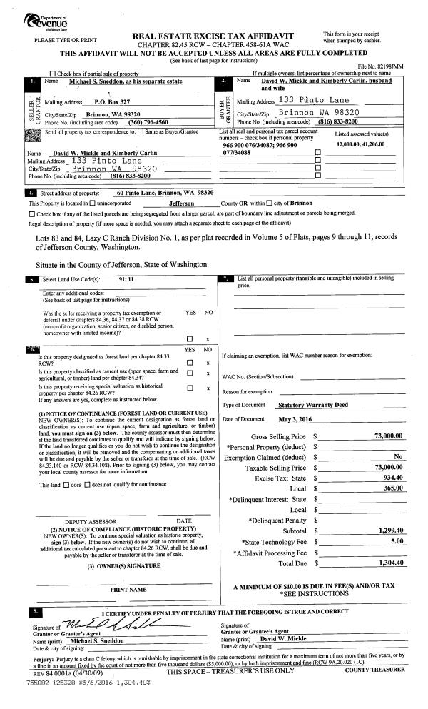 | 3 | 05/03/2016 | SWD | Statutory Warranty Deed | MICHAEL S SNEDDON | DAVID MICKLE & KIMBERLY CARLIN | | | $73,000.00 | 125328 | |