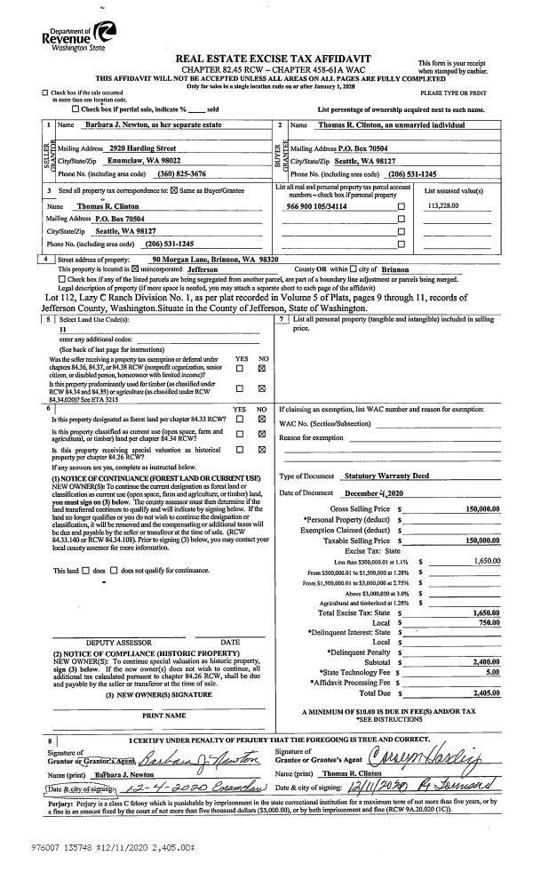 | 2 | 12/04/2020 | SWD | Statutory Warranty Deed | CHARLES M NEWTON | THOMAS R CLINTON | | | $150,000.00 | 135748 | |