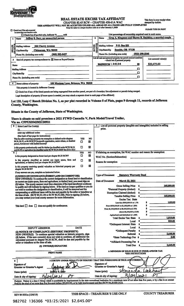 | 1 | 03/22/2021 | SWD | Statutory Warranty Deed | JEFFREY S DERR | GREG A KINGMAN & SHAWN R SMITHLEY | | | $165,000.00 | 136366 | |