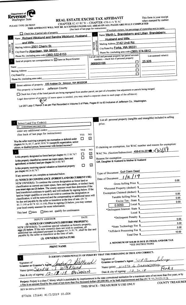 | 2 | 01/02/2019 | QCD | Quit Claim Deed | RICHARD WICKLUND | WORTH L & LILLIAN BRANDEBERRY | | | | 131641 | |