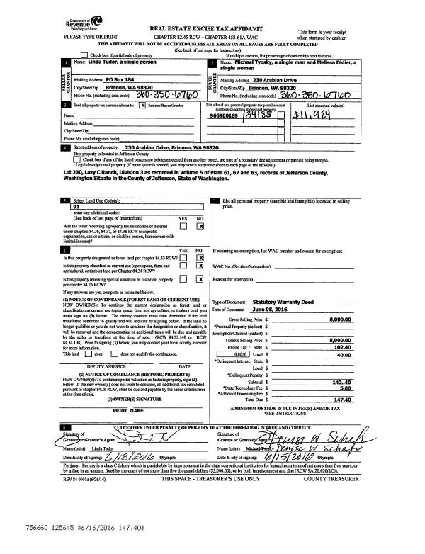 | 1 | 06/08/2016 | SWD | Statutory Warranty Deed | LINDA TUDOR | MICHAEL TYLOSKY | | | $8,000.00 | 125645 | |