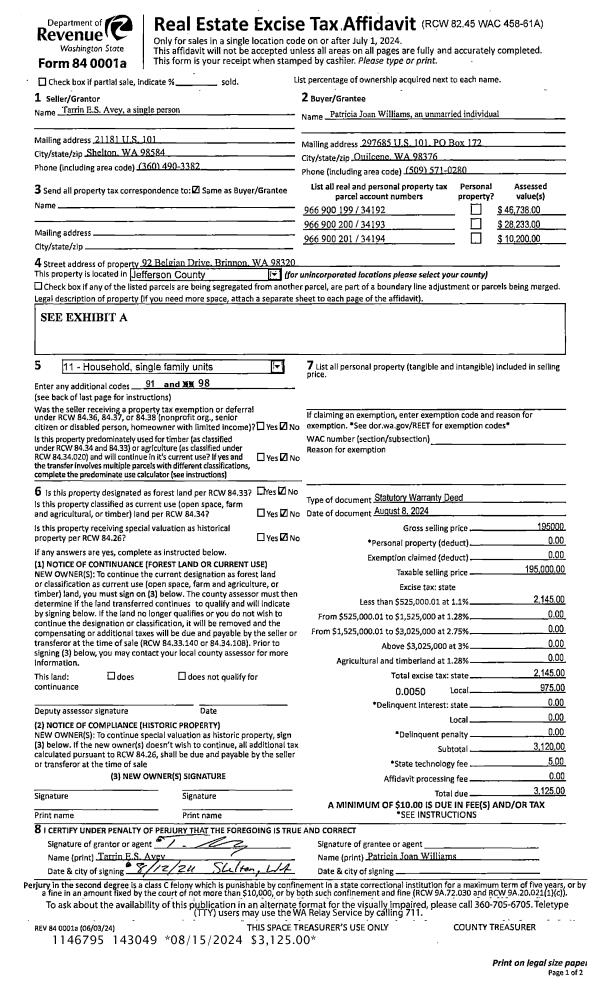 | 1 | 08/08/2024 | SWD | Statutory Warranty Deed | TARRIN E S AVEY | PATRICIA J WILLIAMS | | | $195,000.00 | 143049 | |