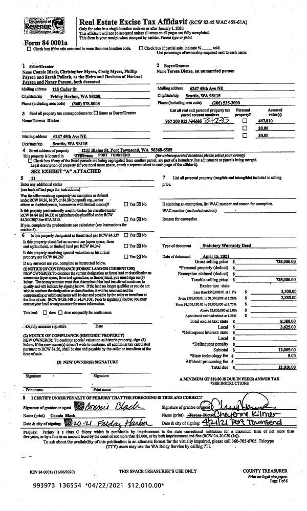 | 1 | 04/15/2021 | SWD | Statutory Warranty Deed | NANCY & HERBERT PAYSON HEIRS OF | TERESA DIETZE | | | $725,000.00 | 136554 | |