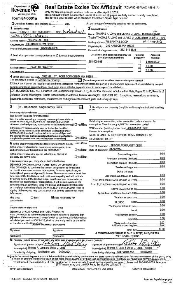 | 1 | 04/30/2024 | SPWD | Special Warranty Deed | THOMAS & ULRIKE LONG | THOMAS F & ULRIKE U LONG LIVING TRUST | | | | 142543 | |