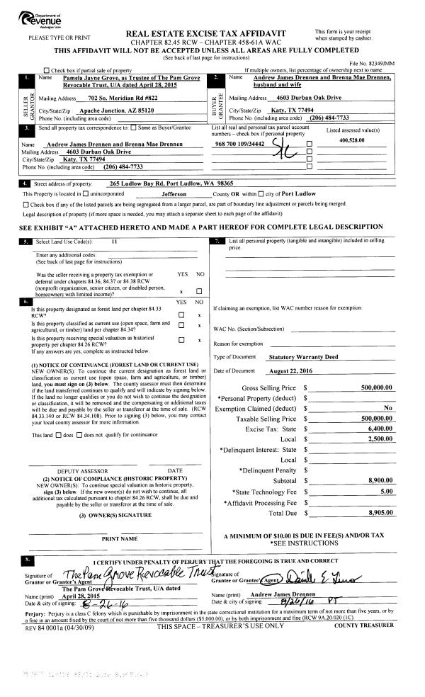 | 1 | 08/22/2016 | SWD | Statutory Warranty Deed | PAM GROVE REVOCABLE TRUST | ANDREW JAMES DRENNEN | | | $500,000.00 | 126158 | |