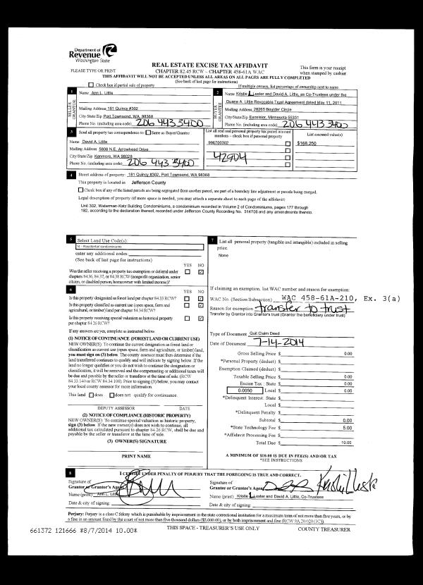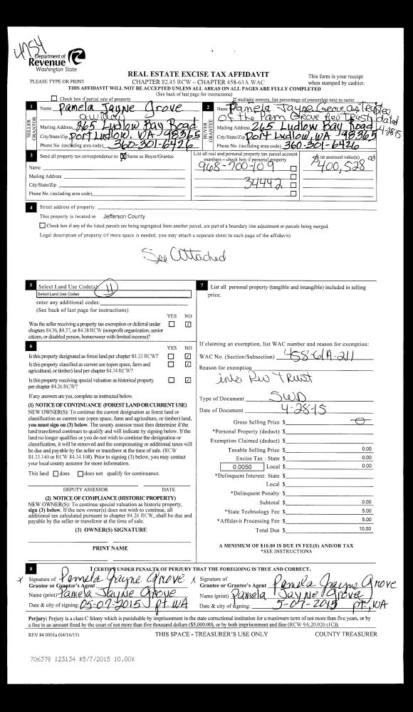 | 2 | 04/28/2015 | SWD | Statutory Warranty Deed | RAYMOND L & PAMELA GROVE | PAM GROVE REVOCABLE TRUST | | | | 123134 | |