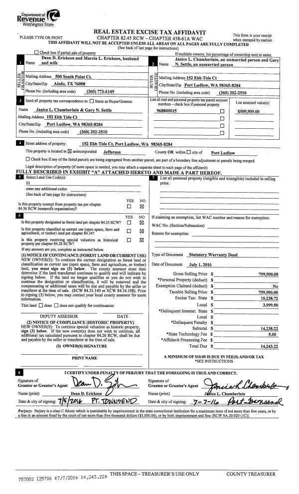 | 3 | 07/01/2016 | SWD | Statutory Warranty Deed | DEAN D ERICKSON | JANICE L CHAMBERLAIN | | | $799,900.00 | 125786 | |