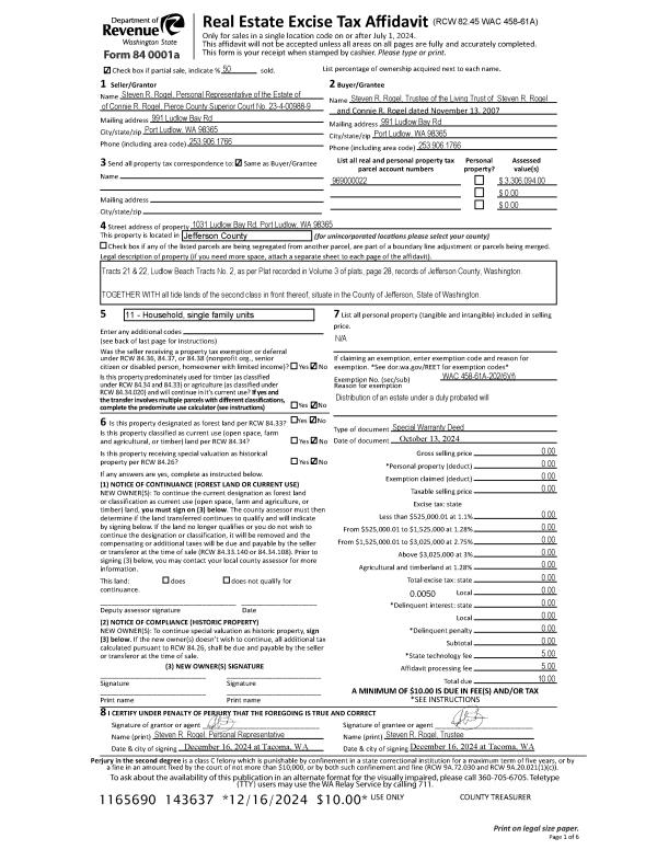 | 2 | 10/13/2024 | SPWD | Special Warranty Deed | STEVEN R ROGEL PERSONAL REPRESENTATIVE | STEVEN R & CONNIE R ROGEL LIVING TRUST | | | | 143637 | |