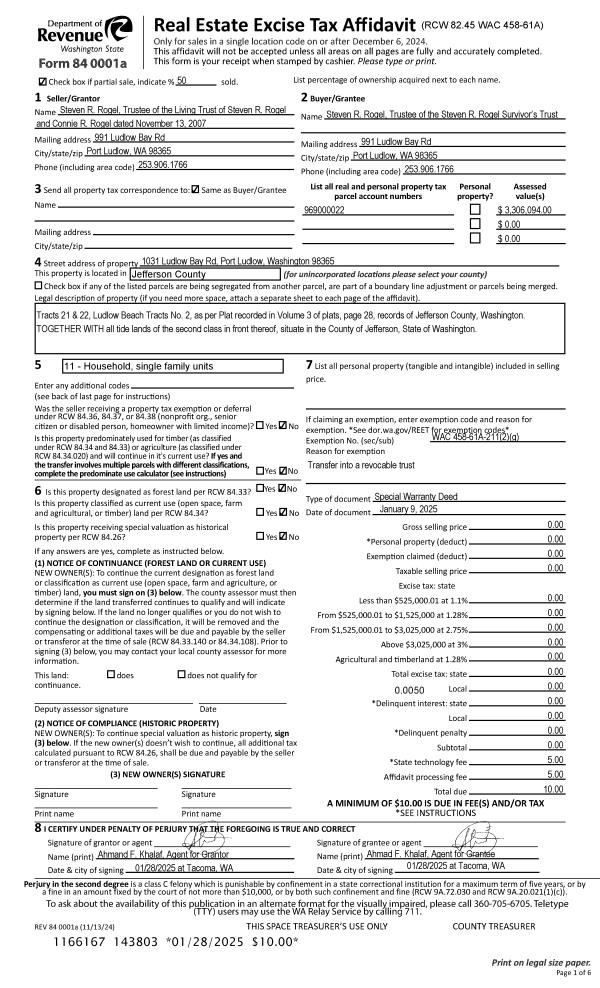 | 1 | 01/09/2025 | SPWD | Special Warranty Deed | STEVEN R & CONNIE R ROGEL LIVING TRUST | STEVEN R ROGEL SURVIVOR'S TRUST | | | | 143803 | |