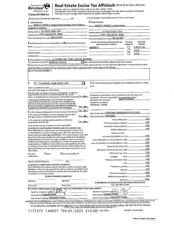 | 1 | 03/31/2025 | PRD | Personal Representatives Deed | EDWARD & JANICE KNODLE | JANICE D KNODLE | | | | 144057 | |