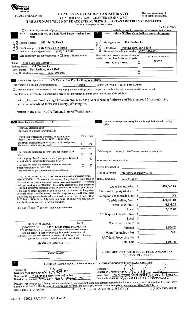 | 1 | 07/23/2019 | SWD | Statutory Warranty Deed | M RAM SASTRY | MARK W CAMPBELL | | | $479,000.00 | 133072 | |