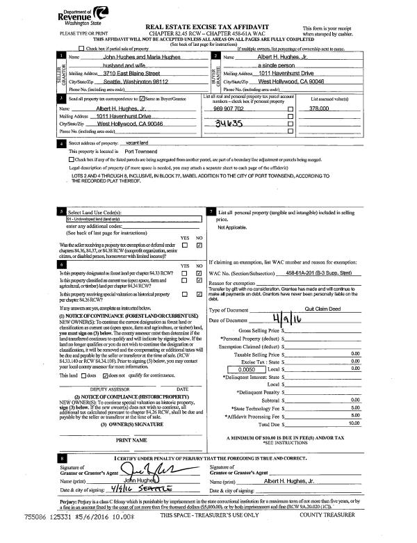 | 2 | 04/09/2016 | QCD | Quit Claim Deed | ALBERT H HUGHES JR | ALBERT HUGHES JR | | | | 125331 | |