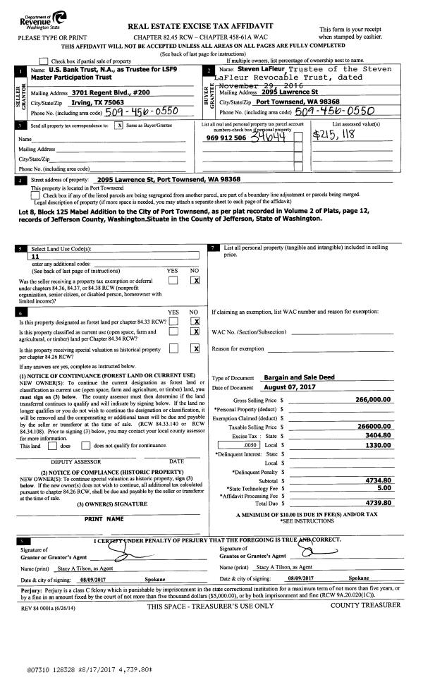 | 2 | 08/07/2017 | BSD | Bargain and Sale Deed | U S BANK TRUST | STEVEN LAFLEUR REVOCABLE TRUST | | | $266,000.00 | 128328 | |