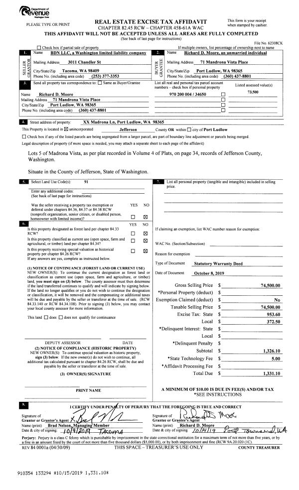 | 1 | 10/08/2019 | SWD | Statutory Warranty Deed | BDN LLC | RICHARD MOORE | | | $74,500.00 | 133294 | |