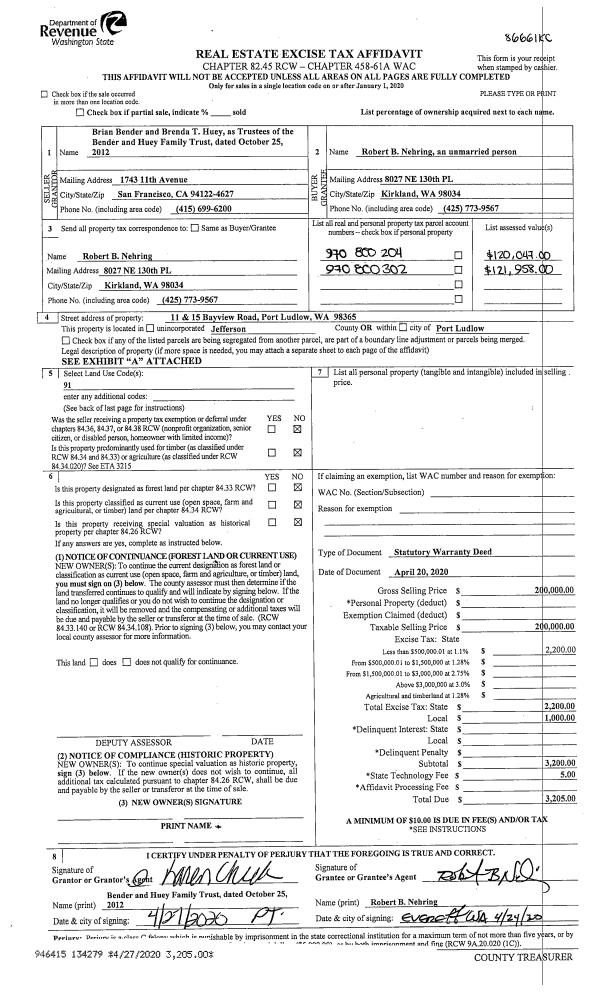 | 1 | 04/20/2020 | SWD | Statutory Warranty Deed | BENDER & HUEY TRUST | ROBERT B NEHRING | | | $200,000.00 | 134279 | |