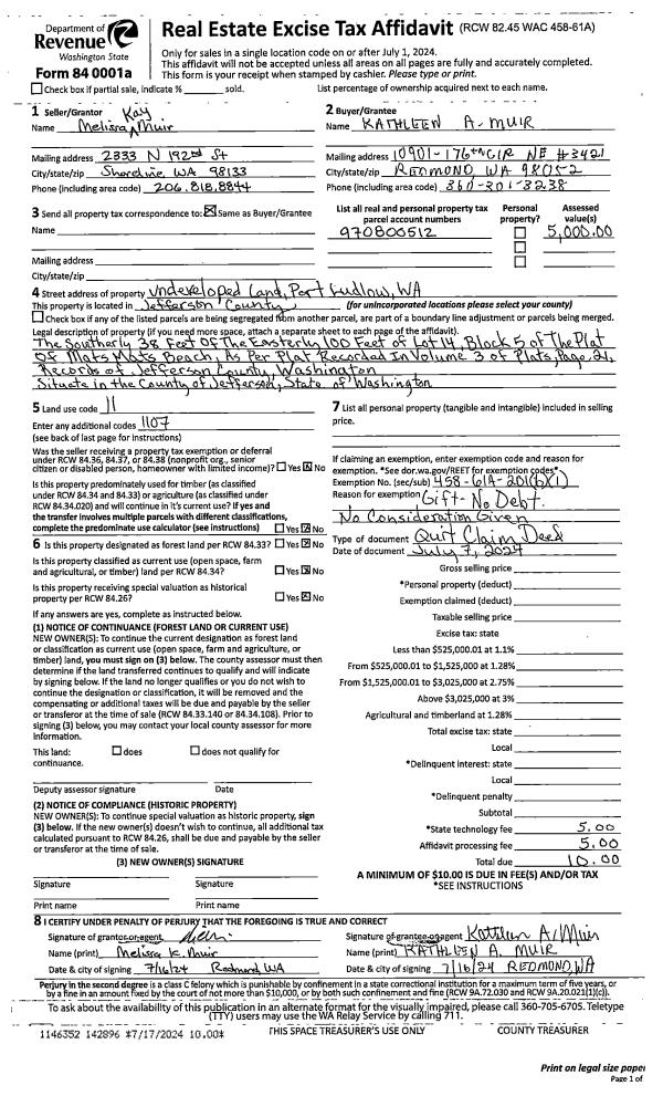 | 2 | 07/07/2024 | SWD | Statutory Warranty Deed | | KATHLEEN A MUIR | | | | 142980 | |