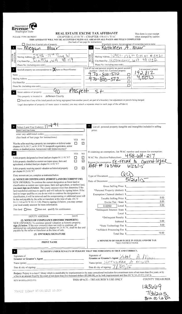 | 3 | 07/07/2024 | QCD | Quit Claim Deed | MELISSA K MUIR | KATHLEEN A MUIR | | | | 142896 | |