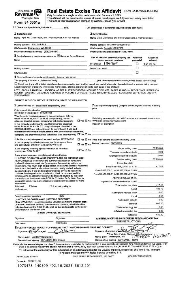 | 1 | 02/08/2023 | SWD | Statutory Warranty Deed | APRIL MV CALANSINGIN | CRAIG & CHLOE GREENWALD | | | $37,950.00 | 140509 | |