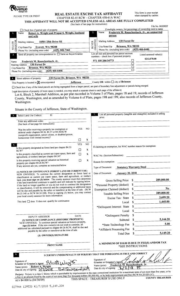 | 2 | 01/30/2018 | SWD | Statutory Warranty Deed | ROBERT A WRIGHT | FREDERICK M RAUSCHENBACH JR | | | $289,000.00 | 129530 | |