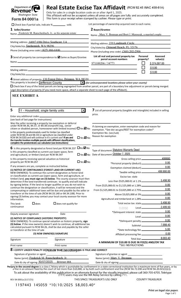 | 1 | 10/07/2025 | SWD | Statutory Warranty Deed | FREDERICK M RAUSCHENBACH JR | MARY V BRENNAN & | | | $499,900.00 | 145059 | |