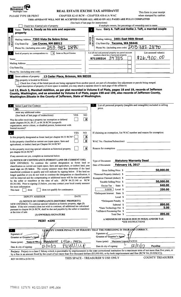 | 1 | 02/16/2017 | SWD | Statutory Warranty Deed | TERRY A DOODY | GARY & KELLIE TAFT | | | $50,000.00 | 127171 | |