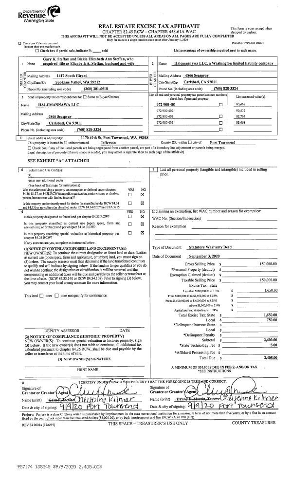| 1 | 09/03/2020 | SWD | Statutory Warranty Deed | GARY K STEFFAN | HALEMANNAWA LLC | | | $150,000.00 | 135045 | WOP |